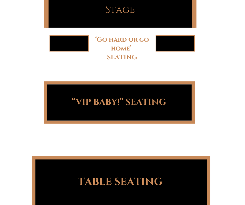 The club is divided in half, the front VIP half is nearest the stage with its own cabaret tables for your group. The back half is GA, with sharing tables. See the chart below.